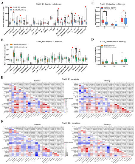Cell type enrichment. Cell type enrichment levels of in total 7 parenchyma and 16 non-parenchyma cell types were displayed as NASH_BS (A) and NASH_Diet (B) subgroups. Immune scores were displayed as NASH_BS (C) and NASH_Diet (D) subgroups (*: p < 0.05). Pearson’s correlation analyses were carried out mutually among 23 cell populations in NASH_BS (E) and NASH_Diet (F) subgroups (*: p < 0.1, **: p < 0.01, ***: p < 0.001, ****: p < 0.0001).