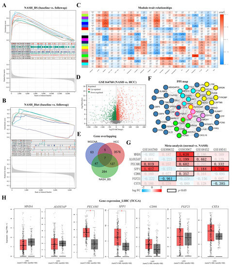 Identification of cancer-associated key genes in NASH_BS livers. Enriched cancer modules were assessed and displayed as (A) NASH_BS and (B) NASH_Diet subgroups. (C) High macrophage-associated gene modules in the NASH_BS subgroup were selected according to WGCNA. Coef [p (scientific notation: e.g., 2e-05 = 2 × 10−5)] values were indicated in each block. (D) DEGs were screened out from GSE164760 (NASH vs. NASH-derived HCC). (E) Overlapping genes were generated from downregulated genes in the NASH_BS subgroup, upregulated genes in the NASH-HCC group, and macrophage associated WGCNA module. (F) The PPI network was generated with 54 overlapping genes from downregulated genes in the NASH_BS subgroup and the macrophage-associated WGCNA module. Hub gene clusters were colored light blue, purple, and green. And cancer associated genes were boarded in red. (G) Fold changes (FC) of gene (MNDA, ALOX5AP, PECAM1, SPP1, CD86, FGF21 and CSTA) expression were meta-analyzed in 5 datasets. FC values with statistical significance (p < 0.05) were highlighted. (H) Gene (MNDA, ALOX5AP, PECAM1, SPP1, CD86, FGF21 and CSTA) expression in healthy and tumor tissues were displayed based on TCGA database (*: p < 0.01).