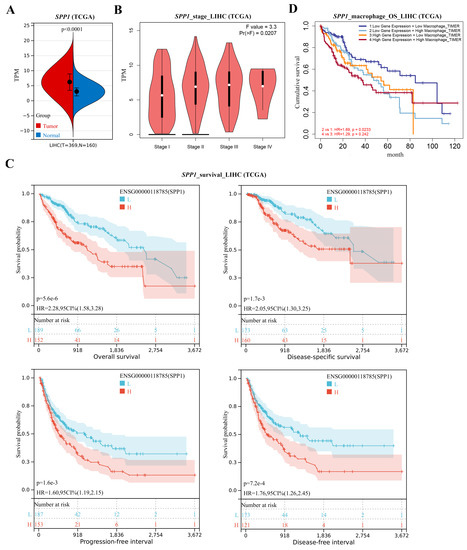Annotation of SPP1 in LIHC/HCC. (A) SPP1 expression was compared in LIHC (TCGA) dataset. (B) The correlation of SPP1 expression and tumor stages was analyzed in LIHC (TCGA) dataset. (C) Correlation of SPP1 expression and survival time (OS, DSS, PFS, and DFS) was analyzed in LIHC (TCGA) dataset. p value is displayed in scientific notation (e.g., 1.6e-3 = 1.6 × 10−3). (D) Correlation of OS, SPP1 expression, and macrophage infiltration levels was analyzed in the LIHC (TCGA) dataset.