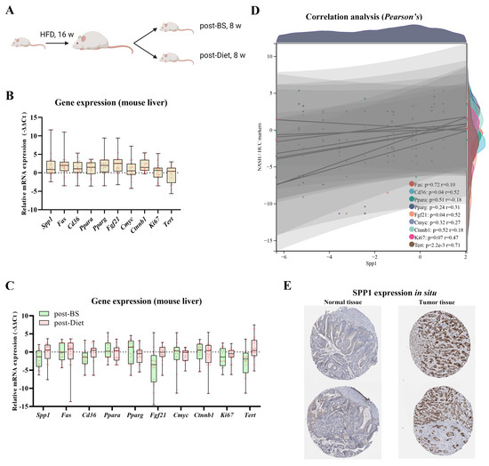 SPP1 expression in mouse models and patients. (A) Post-BS and -Diet on obese mouse models were performed. Relative gene expressions of Spp1 and 9 NASH/HCC biomarkers (Fas, Cd36, Ppara, Pparg, Fgf21, Cmyc, Ctnnb1, Ki67, and Tert) were displayed in obese (B), Post-BS, and -Diet mouse livers (C). (D) Correlation analyses between Spp1 and 9 NASH/HCC biomarkers (Fas, Cd36, Ppara, Pparg, Fgf21, Cmyc, Ctnnb1, Ki67, and Tert) were respectively conducted following the Pearson’s method. (E) SPP1 expressions in situ (normal tissue vs. tumor tissue) were generated from the HPA database.