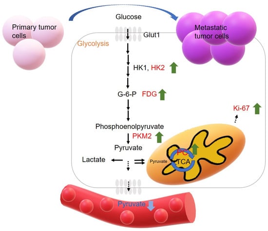 Our hypothesis of glycolytic metabolite alteration in the progression of metastasis is that glycolysis is elevated and the tricarboxylic acid (TCA) cycle is activated to produce adenosine triphosphate (ATP) and metabolites that metastatic tumor cells need for expansion and invasion. At the same time, the serum glycolytic-related metabolites released into the blood circulatory system are decreased due to the catalysis of products of glycolysis in tumor cells. Figure 1 illustrates the hypothesis of glycolytic metabolite alterations in metastatic progression.