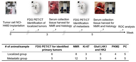 Figure 2. Flow chart of animal experiments. The number of animals used in each experiment are displayed. Mice were identified localized tumors and metastatic tumors by FDG PET/CT followed by the serum metabolites of the NMR studies and tissue Western blotting. The validations of localized and metastatic tumors were by histology.