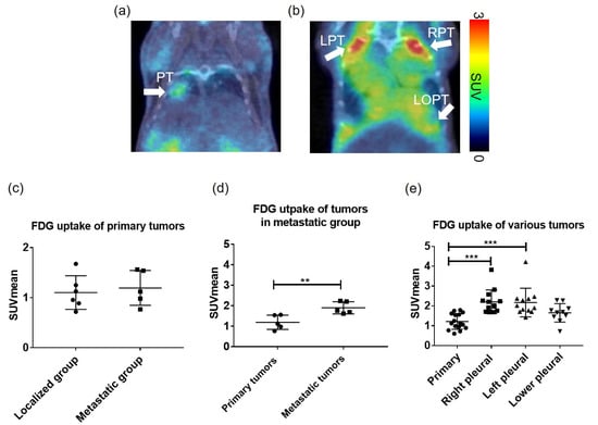 Figure 3. 18F-FDG uptake in primary lung tumors and metastatic tumors. (a) Representative coronal 18F-FDG PET/CT fused image showed one primary lung tumor (PT) growing in the left lung parenchyma in the localized group. (b) Representative coronal 18F-FDG PET/CT fused images of the metastatic group. In the left lung region, the left pleural tumor (LPT) was considered an invasion of the primary tumor. In the right lung region, the right pleural tumor (RPT) and lower pleural tumor (LOPT) were defined as metastases. (c) The 18F-FDG uptakes of primary lung tumors between localized and metastatic mice show no significant difference (localized group, SUVmean: 1.10 ± 0.34, N = 6, vs. metastatic group, SUVmean: 1.20 ± 0.35, N = 5, p > 0.79). (d) Tumor 18F-FDG uptake in metastatic mice, the metastases significantly elevated compared with primary tumors (primary tumors, SUVmean: 1.20 ± 0.35 vs. metastatic tumors, SUVmean: 1.97 ± 0.30 **, N = 5 for each group, ** p < 0.01. (e) Collected various lung tumors in studied mice, the significantly increased 18F-FDG uptake of tumors in the pleural was found (primary tumors, SUVmean: 1.21 ± 0.39, N = 16 vs. right pleural tumors, SUVmean: 2.21 ± 0.60 ***, N = 13, left pleural tumors, SUVmean: 2.17 ± 0.72 ***, N = 12, respectively ** p < 0.01, *** p < 0.001).