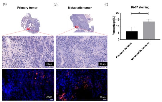 Figure 5. Metastatic tumors showed a higher proliferation rate compared with primary tumors that are from the localized group. (a) Representative HE-stained sections of primary tumors infiltrated by cells with large nuclei corresponding to Ki67-stained and DAPI-stained sections of primary tumors (×200, scale bars 20 µm). (b) Representative HE-stained sections of metastatic tumors with disturbed cells corresponding to Ki67-stained and DAPI-stained sections of metastatic tumors (×200, scale bars 20 µm). (c) The quantitative expression of fluorescent Ki-67 of metastatic tumors is significantly increased compared to that of primary lung tumors (primary tumors 6.052 ± 1.934% vs. metastatic tumors 13.41 ± 1.184%, N = 3 for each group, * p < 0.05).