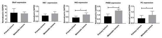 Figure 6. The glycolytic protein expression in primary tumors from the localized group and metastatic tumors from the metastatic group by Western blotting studies. Quantification of the expression of Glut1, HK1, HK2, PKM2, and PC protein by normalized to GAPDH expression. The significantly increased expression of HK2, PKM2, and PC protein in the metastatic tumors was shown. N = 3 in each group for Glut1, HK1 and HK 2, N = 4 in each group for PKM2, N = 5 in each group for PC, * p < 0.05.