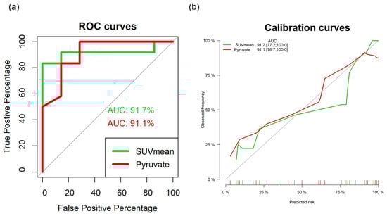 Figure 7. ROC curves and calibration curves of PET/CT parameters, SUVmean, and serum metabolites, pyruvate to diagnose the localized (N = 7) or metastatic (N = 12) diseases. (a) The imaging parameter, SUVmean shows slightly higher AUC values than that of serum metabolite, pyruvate; however, the AUCs of the two parameters are over 90%, SUVmean and pyruvate are the promising predictors for the differentiation of localized or metastatic lung cancers. (b) The calibration curve of imaging parameter and serum metabolite, normalized pyruvate level in a preclinical lung cancer model.