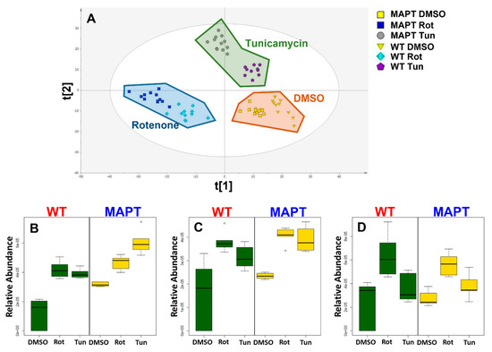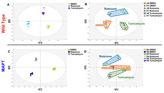 Multivariate partial least squares−discriminant analysis (PLS−DA) of Rotenone and Tunicamycin treatment in wild type and MAPT mutant dopamine neurons. (A) PLS-DA scores plot of combined treatment groups in wild type neurons (t[1] = 16.4% and t[2] = 7.7%) (B) PLS-DA scores plot of treatment response in individual wild type cell lines (t[1] = 38.3% and t[2] = 15.4%) (C) PLS-DA scores plot of combined treatment groups (t[1] = 18.2% and t[2] = 8.9%) (D) PLS-DA scores plot of treatment response in individual MAPT cell lines (t[1] = 38.6% and t[2] = 7.9%). Abbreviations: MAPT; microtubule associated protein tau.