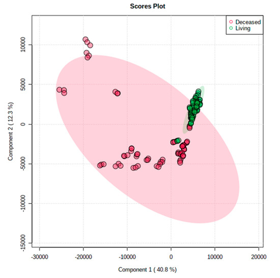 The principal component analysis score plots of deceased and liver donor liver grafts. The plot shows that the metabolites in the living donor liver grafts were similar, but the metabolites varied in the deceased liver grafts.
