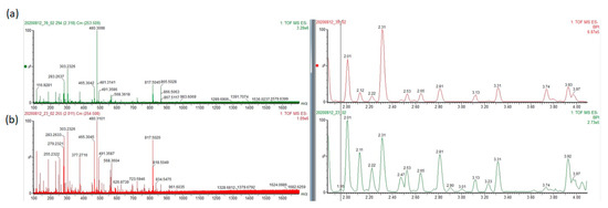 Liquid chromatographic separation was achieved on a 100 mm × 2.1 mm Acquity 1.7 μm C18 column (Waters Corp; Milford, MA, USA) using an ACQUITY TM Ultra Performance Liquid Chromatography system (Waters Corp; Milford, MA, USA). The column was maintained at 45 °C at a flow rate of 0.5 mL/min. Samples were eluted from the LC column using a linear gradient. The gradient started at 40% B and linearly increased to 99% B within 10 min, and then decreased to 40% B at 10.1 min. Mass spectrometry was performed on a Waters Q TOFMS or Agilent Q TOF operated in positive or negative ion mode. The scan range was from 100 to 1700 m/z. The desolvation gas was set to 900 L/h at a temperature of 550 °C, the cone gas set to 0 l/h and the source temperature set at 120 °C. The capillary voltage and cone voltage were set to 2500 and 25 V, respectively. The MCP detector voltage was set to 2750 V. The Q TOFMS acquisition rate was set at 0.1 s with a 0.02 s interscan delay [12,17,18].