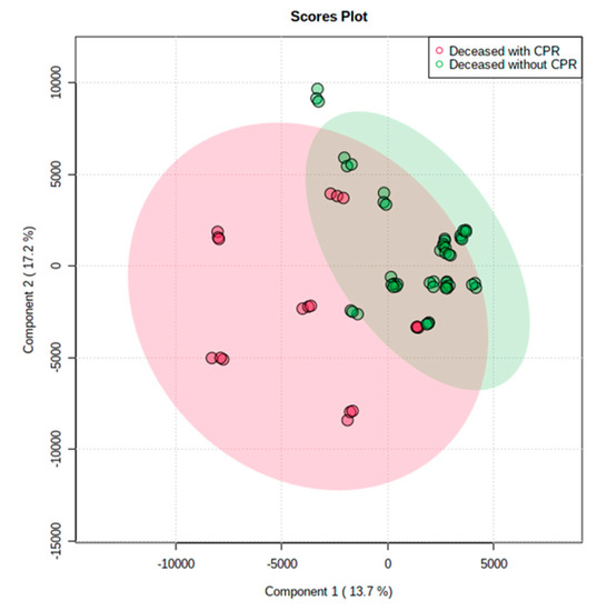 The principal component analysis score plots of deceased liver grafts with or without CPR. The plot showed that lipid metabolites were more various in deceased liver grafts with a history of CPR than without a history of CPR.