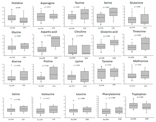 The difference of amino acid between the deceased donors with or without CPR. The liver grafts from the donors with CPR had higher levels of serine, aspartic acid and proline than the liver grafts from donors without CPR.