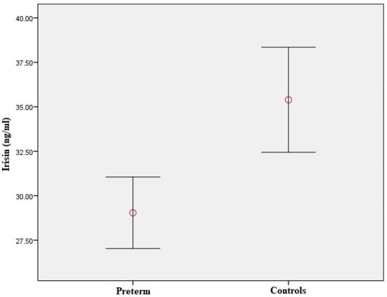 Figure 1. Plasma irisin levels in preterm-born children compared to controls. Red circle represents the mean value of plasma irisin levels in children born prematurely and controls respectively; error bars represent standard error of mean.