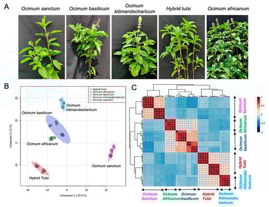 Differentiation of Ocimum samples from five different species according to their metabolite profiles. (A) Images of five different Ocimum species, namely, O. sanctum, O. basilicum, O. kilimandscharicum, Hybrid Tulsi, and O. africanum. (B) PLS-DA score plot for the first component (23.9%) vs. second component (11%), indicating discrimination between five different species of Ocimum samples acquired in LC-MS negative ionisation mode. (C) Pearson correlation of Ocimum samples from five different species.