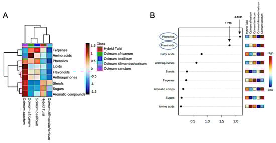 Classification of different metabolite classes in five different Ocimum species samples. (A) Quantitative analysis of nine metabolite classes in Ocimum species samples analysed using HCA. (B) Variable importance in projection of metabolite classes for the analysed five Ocimum species samples.