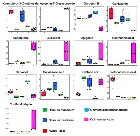 Box plot for discriminatory metabolite markers, identifying the differences in five different Ocimum species, namely, O. sanctum, O. basilicum, O. kilimandscharicum, Hybrid Tulsi, and O. africanum. Normalised intensities are presented in the y-axis.