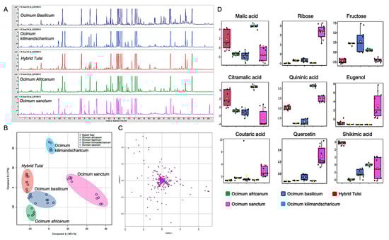 GC-MS-based metabolite fingerprinting identified species-specific differences in five different Ocimum species samples. (A) TIC of metabolite profile of five different Ocimum species. (B) PLS-DA scores plot for the first component (28.1%) vs. second component (17%), indicating differences between Ocimum species samples. (C) Corresponding loading plot for the metabolites. (D) Box plot for discriminatory marker metabolites, identifying the differences in five different Ocimum species. Normalised intensities are presented in the y-axis.
