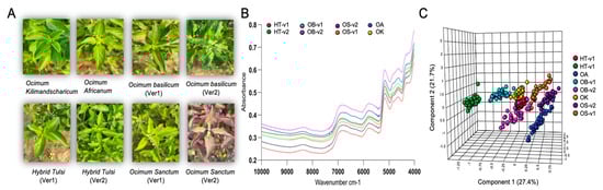 FT-NIR-based rapid metabolic fingerprinting identified species- and variety-specific variation of Ocimum samples. (A) Images of eight different Ocimum samples. (B) FT-NIR spectrum of average spectra of Ocimum samples from eight different varieties. (C) The corresponding PLS-DA plot for the first component (27.4%) vs. second component (21.7%) differentiated the Ocimum species and varieties.