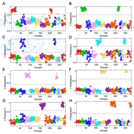 Predicted models for Ocimum samples by PLS-DA model. (A) HT-v1—Hybrid Tulsi variety 1; (B) HT-v2—Hybrid Tulsi variety 2; (C) OB-v1—Ocimum basilicum variety 1; (D) OB-v2—Ocimum basilicum variety 2; (E) OS-V1—Ocimum sanctum variety 1; (F) OS-V1—Ocimum sanctum variety 2; (G) OA—Ocimum africanum; (H) OK—Ocimum kilimandscharicum.