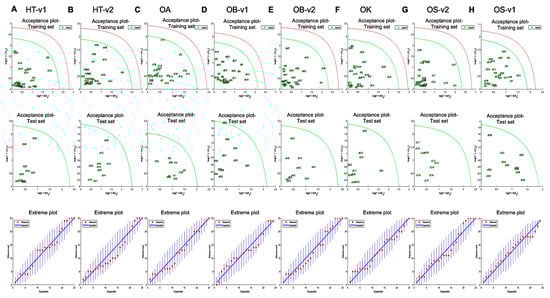 The application of DD-SIMCA for the classification of Ocimum samples from (A) HT-v1—Hybrid Tulsi variety 1; (B) HT-v2—Hybrid Tulsi variety 2; (C) OA—O. africanum; (D) OB-v1—O. basilicum variety 1; (E) OB-v2—O. basilicum variety 2; (F) OK—O. kilimandscharicum; (G) OS-V2—O. sanctum variety 2; (H) OS-V1—O. sanctum variety 1. Acceptance plots for training set and test set shown one to one below and the corresponding extreme plots for each training set shown far down to the acceptance plots. The acceptance plot for training set provides a graphic representation of the acceptance area, the area inside the green curve and the red line is the outlier cut-off with threshold α = 0.01. Authentic samples falling outside the green curve were considered extremes.