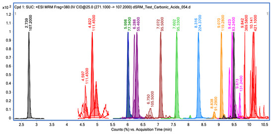 For each of the carboxylic acids, the spectra of monoisotopic mass, decomposition by primary fragment ions with the ranking of activation energy, and adducts of target metabolites were obtained, if applicable to the conditions of the chromatographic separation. Figure 2 shows the chromatogram of carboxylic acid derivatives.