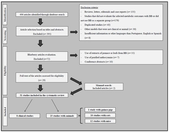 One hundred and one articles, therefore, appeared to be eligible at this point and had their full texts evaluated. However, after full-text analysis, 72 articles were excluded because of the use of pomace or leaf extracts instead of the whole fruit, as well as the use of purified anthocyanins or conference abstracts. Therefore, a total of 29 articles fulfilled the eligibility criteria [,,,,,,,,,,,,,,,,,,,,,,,,,,,,]. Moreover, two articles were identified by a manual search of the reference lists of the 29 articles [,], totalizing 31 articles. Among the included studies, eight were clinical trials [,,,,,,,], 10 used animal models with rats [,,,,,,,,,], 12 were animal models with mice [,,,,,,,,,,,], and one study included Guinea pigs [].