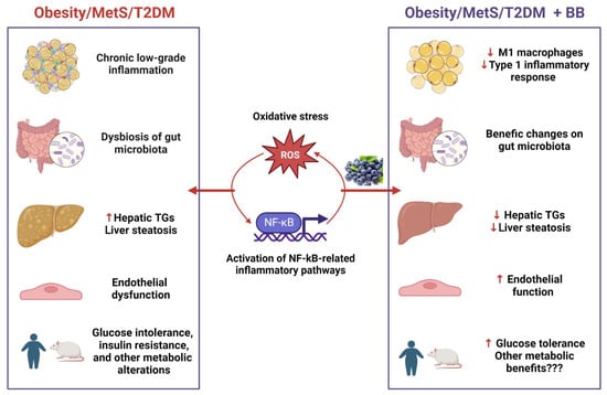 The effects of blueberries (BB) and bilberries in outcomes related to obesity, metabolic syndrome (MetS), and type 2 diabetes mellitus (T2DM). Obesity and associated metabolic disorders are characterized by systemic and chronic low-grade inflammation, dysbiosis of the gut microbiota, and other metabolic alterations, including increased triglycerides (TGs) content in the liver, liver steatosis, glucose intolerance, insulin resistance, and endothelial dysfunction. The main mechanisms behind these alterations are the increased oxidative stress and activation of the nuclear factor-κB (NF-κB)-related pro-inflammatory pathways. Anthocyanins and other components of blueberries and bilberries are able to decrease the production of reactive oxygen species (ROS) and the activation of the transcription factor NF-κB, thus decreasing the expression of its pro-inflammatory target genes. The attenuation of these two key mechanisms may lead to: (1) decreased recruitment of pro-inflammatory M1 macrophages into the adipose tissue and type 1 inflammatory response (T helper cells); (2) benefic changes on the composition of gut microbiota, further decreasing NF-κB activation; (3) decreased TG content in the liver and protection against hepatic steatosis; (4) improvement of endothelial function; and (5) improvement of glucose tolerance. Other beneficial effects of BB consumption still need to be confirmed by well-designed clinical studies. ↓ Reduction; ↑ Increase. This figure was created using BioRender.com (accessed on 1 December 2022).