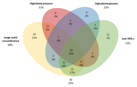 Venn diagram of components of the metabolic syndrome (MetS) in adults from a population-based study in urban Brazil (n = 192). The cut-offs were: large waist circumference (≥80 cm for women or ≥90 cm for men); Low HDL-c (<50 mg/dL for women or <40 mg/dL for men); high blood pressure (systolic pressure ≥ 130 and diastolic pressure ≥ 85 mmHg) and High plasma glucose ≥ 100 mg/dL [1].
