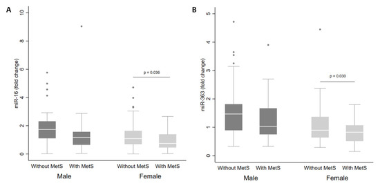Levels of miR-16 (A) and miR-363 (B) in plasma from adults according to sex and metabolic syndrome (MetS) status. The sample sizes were as follows: male (without MetS n = 57|MetS n = 30); female (without MetS n = 70|MetS n = 35). The comparisons of levels in individuals with and without MetS by sex were conducted using the adjusted Wald test. The box plots depict the 25th–75th percentile, and the white line represents the median for each group. p < 0.05 indicates statistically significant differences.