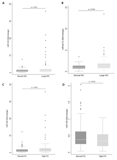Levels of miRNA in plasma according to waist circumference (WC) (A,B) and fasting glucose (FG) status (C,D). The sample sizes were as follows: miR-122 and miR-let-7c (Normal WC n = 62|Large WC n = 130); miR-122 (Normal FG n = 131|High FG n = 61) and miR-139 (Normal FG n = 101|High FG n = 41). Comparisons between groups in miRNA levels were conducted using the adjusted Wald test. The box plots depict the 25th–75th percentile, and the white line represents the median of each group. p < 0.05 indicates statistically significant differences.