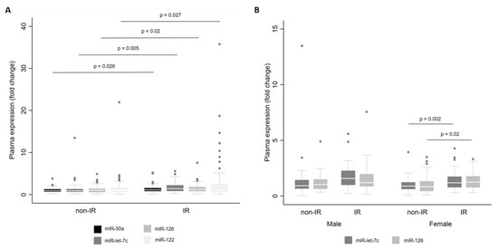Levels of miR-30a, miR-122, miR-126 and miR-let-7c in plasma from adults with and without insulin resistance (IR) for the whole cohort (A) and by sex (B). Comparisons between groups were conducted using the adjusted Wald test. The box plots depict the 25th–75th percentile, and the white line represents the median of each group. p < 0.05 indicates statistically significant differences.