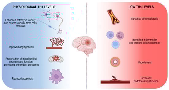 Physiological THs maintenance is essential to counteract ischemic stroke onset. Schematic illustration of positive THs-dependent effects on brain. The image represents the harmful consequences of low THs levels indicating the main mechanisms by which they influence the onset of the disease.