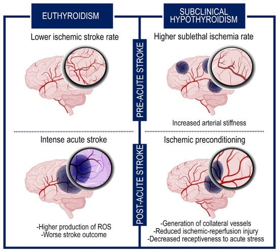 Even if the condition of subclinical hypothyroidism (characterized by high TSH levels but normal T3 and T4 levels) increases the incidence of transient ischemic attacks, recent reports suggest that it has a beneficial impact on preventing post-stroke severe outcome and reducing the mortality rate [,]. Multiple suppositions have been put forward to interpret this effect. One explanation might be that the elevated TSH levels can result in an increase of systemic vascular resistance for the strengthened arterial stiffness, that in turn incurs in sublethal ischemia prompting the generation of collateral vessels. These events ameliorate the response to intense cerebral accidents and improve the clinical picture (Figure 2) [].