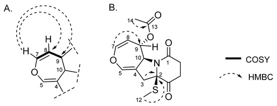 Main observed HMBC and COSY correlations for (9). (A) The correlation between the sign at δ 6.29 and H-8 (δ 4.69)/H-9 (δ 5.80) and δ 6.29 with C-8 and C-9 can be visualized through analysis of COSY and HMBC experiments, respectively. (B) The correlation of hydrogen at δ 2.07 with the carbonyl at C-13 and between the methyl hydrogens H-12 (δ 2.26) and C-2 (Figure 3B) are observed at HMBC experiments. All HMBC correlations are from protons to carbon (1H−13C).