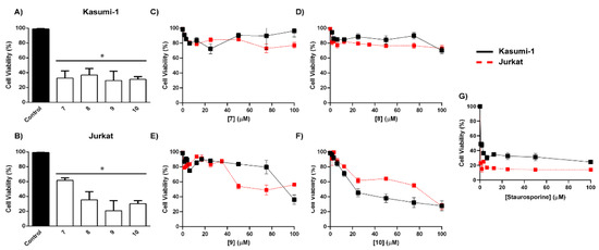 In order to examine the effect of Compounds (7), (8), (9), and (10) and the cell death mechanism, Kasumi-1 and Jurkat cells were selected. A reduction in cell viability was observed for all compounds in both lineages after 48 h (Figure 5A,B). Therefore, we constructed a concentration–response curve for Kasumi-1 and Jurkat cells after incubation (24 h) of compounds (7), (8), (9), and (10) (Figure 5C–F). Compound (10) presented a higher efficacy compared to the other compounds on target cells (the value of 50 μM EC50 was used for both) (Figure 5F). Staurosporine [20], a potent apoptosis inducer, was used as a positive control (Figure 5G). Additionally, compound (10) did not show a cytotoxicity effect on normal PBMC cells.