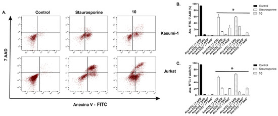 Quantitative analysis of cell death by compound (10) in leukemic cells. Kasumi-1 (50 μM) and Jurkat (50 μM) were stimulated with compound (10) for 24 h. The rate of apoptotic cells was assessed with annexin V-FITC/7-AAD staining. (A,B) Representative flow cytometry dot plots. (C) Quantitative measurements of cell death in Kasumi-1 and Jurkat. These results are the mean ± SEM of three independent experiments performed in duplicate. * p < 0.05. Statistical analysis was performed against a control (unstimulated sample). ANOVA test was followed by Dunnett’s post hoc test.