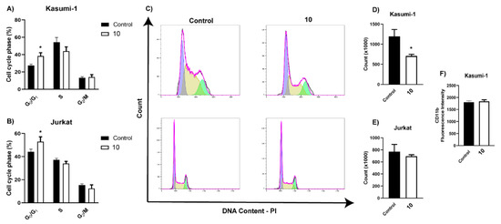 The distribution of cell cycle phases was determined by propidium iodide (PI) staining and flow cytometry analysis. Kasumi-1 and Jurkat cells (105/mL) were treated with 10 (10 μM or 1 μM, respectively) for 72 h. Then, the cells were fixed and permeabilized as previously described and treated with 4 μg/mL RNase (Sigma Aldrich, St. Louis, MI, USA) for 45 min at 37 °C. For DNA labeling, cells were incubated with 5 μg/mL of PI (Sigma Aldrich, St. Louis, MI, USA). Percentages of cells within cell cycle compartments (G1/G0, S, and G2/M) were performed using an Accuri C6 flow cytometer (BD Biosciences, Mississauga, Canadá). A total of 40,000 events were acquired.