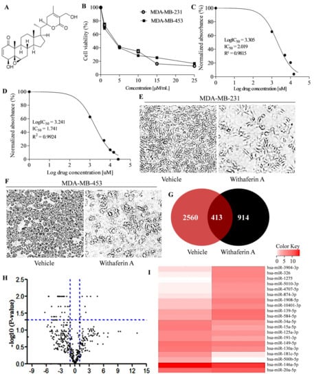 Figure 1. The effect of Withaferin A on the miRNA expression profile in triple-negative cancer cells. (A) Chemical structure of Withaferin A adapted from PubChem (PCID 265237) (B) Effect of Withaferin A on MDA-MB-231 and MDA-MB-453 cells in 24 h treatment (C,D) Calculation of IC50 concentration in 24h Withaferin A treatment in MDA-MB-231 and MDA-MB-453 cells using regression analysis, respectively. (E) Effect of vehicle and Withaferin A treatment on MDA-MB-231 and (F) MDA-MB-453 cells morphology at IC50 concentration in 24h treatment, respectively. (G) Venn diagram analysis showing common miRNAs expressed in vehicle- and Withaferin A (IC50)-treated MDA-MB-231 cells in 24h exposure. (H) Volcano plot showing significant differential expression of miRNAs in Withaferin A (IC50)-treated MDA-MB-231 cells in 24h exposure compared to vehicle-treated cells. (I) Heatmap showing expression pattern of top twenty differentially expressed miRNAs in Withaferin A (IC50)- and vehicle-treated group in 24 h exposure.