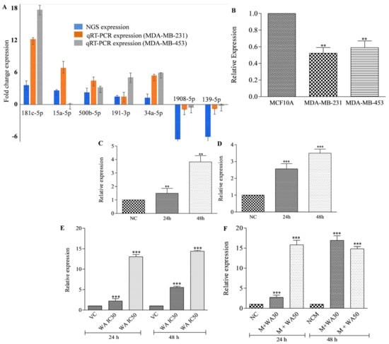 Figure 3. qRT-PCR expression analysis of differentially expressed miRNA(s). (A) Expression analysis of miRNAs in MDA-MB-231 and MDA-MB-453 cells using qRT-PCR technique compared with the next generation sequencing expression pattern. (B) Expression analysis of top differentially expressed miRNA (miR-181c-5p) in breast normal cells (MCF10A) and triple-negative breast cancer cells in a 24 h culture. (C) Expression analysis of miR-181c-5p in transient miR-181c miRNA transfected MDA-MB-231 cells in 24 h and 48 h exposure. (D) Expression analysis of miR-181c-5p in transient miR-181c miRNA transfected MDA-MB-453 cells in 24 h and 48 h exposure. The expression patterns of the miRNA in transfected cells were compared with the mimic negative control transfected cells. (E) Effect of Withaferin A treatment alone on miR-181c-5p expression in MDA-MB-231 cells in 24 h and 48 h exposure. (F) Effect of Withaferin A treatment in combination with miR-181c mimic on miR-181c-5p expression in MDA-MB-231 cells in 24 h and 48 h exposure. The qRT-PCR experiments were performed in triplicate independently and data are presented as mean ± standard error mean (SEM). Given values across the treatment are significantly different from each other at ** p < 0.05, where *** (p < 0.001).NC—negative control; M—miR-181c mimic; NCM—negative control mimic; WA30—Withaferin IC30; WA50—Withaferin IC50.