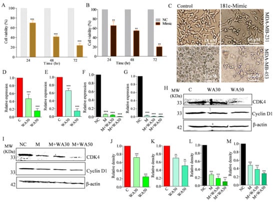 Figure 4. The effect of miR-181c-5p forced expression on cell viability and morphology, and the effect of Withaferin A and co-treatment (mimic and Withaferin) on cell-cycle marker proteins in triple-negative breast cancer cells. (A) Effect of miR-181c-5p forced expression on MDA-MB-231 cell viability in 24, 48, and 72 h exposure at 60 nm concentrations. (B) Effect of miR-181c-5p forced expression on MDA-MB-453 cell viability in 24, 48, and 72 h exposure at 60 nm concentrations. (C) Effect of miR-181c-5p forced expression on MDA-MB-231 and MDA-MB-453 cell morphology in 24 h exposure at 60 nm concentration. The mRNA gene expression of (D) CDK4 and (E) CCND1 in Withaferin A (IC30 and IC50)-treated MDA-MB-231 cells in 24 h exposure compared to the vehicle control. (F) CDK4 and (G) CCND1 mRNA expression in miR-181c-5p mimic transfected and co-treated (mimic + WAIC30 and mimic + WAIC50) MDA-MB-231 cells in 24 h exposure in comparison to negative control. (H) Protein expression level of CDK4 and cyclin D1 in Withaferin A (IC30 and IC50) 24 h treated MDA-MB-231 cells. (I) Protein expression level of CDK4 and cyclin D1 in miR-181c-5p mimic transfected and co-treated (mimic + WAIC30 and mimic + WAIC50) in 24 h incubated MDA-MB-231 cells. Relative densities of immuno bands of (J) CDK4, (K) cyclin D1 in Withaferin A (IC30 and IC50) 24 h treated MDA-MB-231 cells; (L) CDK4 and (M) cyclin D1 in miR-181c-5p mimic transfected and co-treated (mimic + WAIC30 and mimic + WAIC50) in 24 h incubated MDA-MB-231 cells, estimated by image lab software 6.0.1 Bio-Rad. Cell viability, qRT-PCR, and Western blot experiment data are representative of three independent experiments. *** p < 0.001 (ANOVA); ** p < 0.01 (ANOVA) compared with respective control. Values represent mean ± standard error mean (SEM) (n = 3).