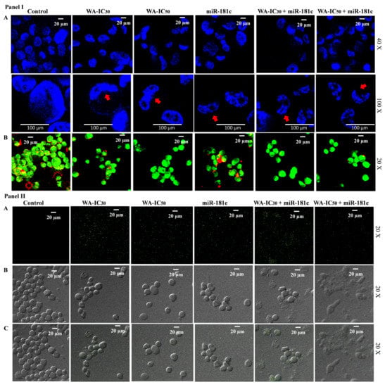 Triple-negative breast cancer cells (MDA-MB-231) cells (2 × 106) were seeded into each well of a 6-well plate and left overnight to adhere; afterwards, cells were transfected with the miR-181c-5p mimic alone or co-treatment with WA (IC30 and IC50) for 24 h. After incubation, the cells were harvested and immediately stained with the Hoechst 33342 dye (5 µg/mL) to study the morphological nuclear changes [12]. Furthermore, the cells were separately stained with the JC-1 dye (5 μM/mL) to check the mitochondria membrane potential (ΔΨm) in test cells [12]. Moreover, 2, 7-dichlorodihydrofluorescein diacetate (H2DCFDA) dye mediated staining (1 µM/mL) of the cells was performed to assess the reactive oxygen species (ROS) generation [12]. The stained cells for each individual experiment were kept at room temperature for 20 min and 4 h in a dark place. After incubation, the cells were washed thrice with PBS, and without delay, the stained cells were examined using a confocal laser scanning microscope (CLSM) facility available in the Central Instrumentation Laboratory (CIL) of the University. The results were compared with vehicle treated cells.