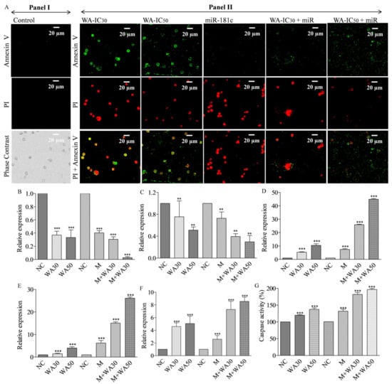 Figure 6. The effect of Withaferin A and mi-181c-5p mimic co-treatment on the apoptotic cell population, apoptosis-related marker expression, and caspase enzymatic activity in TNBC cells. (A) Panel I: Apoptosis event in miR-181c-5p mimic negative control transfected MDA-MB-231 cells detected by annexin V and PI. Panel II: Apoptosis induction in Withaferin A (IC30 and IC50), miR-181c-5p mimic and their co-treatment in MDA-MB-231 cells in 24 h exposure. qRT-PCR based expression analysis of apoptosis-related markers. (B) PARP, (C) BCL-XL, (D) Caspase 3, (E) Caspase 8 (F), and BAX in Withaferin A (IC30 and IC50), miR-181c-5p mimic, and their co-treatment in MDA-MB-231 cells in 24 h exposure. (G) Caspase 3/7 enzymatic activity measured by Glo caspase 3/7 assay kit in Withaferin A (IC30 and IC50), miR-181c-5p mimic, and their co-treatment in MDA-MB-231 cells in 24 h exposure. The data presented as mean ± SD. Experiments were performed in triplicate and represented by mean ± standard error mean (SEM). Expression values across the treatment are significantly different from each other at p < 0.05. ** (p < 0.01) and *** (p < 0.001).