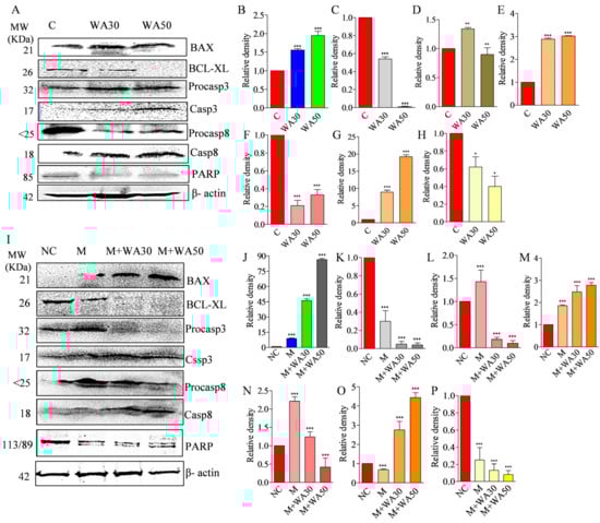 Figure 7. The effect of Withaferin A, miR-181c-5p mimic, and their co-treatment on apoptosis-related protein markers in triple-negative breast cancer cells. (A) Protein expression level of BAX; BCL-XL; Procaspase 3, 8; Cleaved caspase 3, 8; and PARP in WA IC30 and IC50 concentration treated MDA-MB-231 cells in 24 h. Relative densities of immuno bands of (B) BAX, (C) BCL-XL, (D) Procaspase 3, (E) Cleaved caspase 3, (F) Procaspase 8, (G) Cleaved caspase 8, and (H) PARP were estimated by image lab software 6.0.1 Bio-Rad. (I) Protein expression level of BAX; BCL-XL; Procaspase 3, 8; Cleaved caspase 3, 8; and PARP in miR-181c-5p mimic transfected and mimic + WA (IC30 and IC50) co-treated MDA-MB-231 cells in 24 h. Relative densities of the immuno bands of (J) BAX, (K) BCL-XL, (L) Procaspase 3, (M) Cleaved caspase 3, (N) Procaspase 8, (O) Cleaved caspase 8, and (P) PARP estimated by image lab software 6.0.1 Bio-Rad. Data are representative of three independent experiments. *** p < 0.001 (ANOVA); ** p < 0.01 (ANOVA); * p < 0.01 (ANOVA) compared with respective control. Values represent mean ± standard error mean (SEM) (n = 3). NC—negative control; M—miR-181c mimic; WA30—Withaferin IC30; WA50—Withaferin IC50.