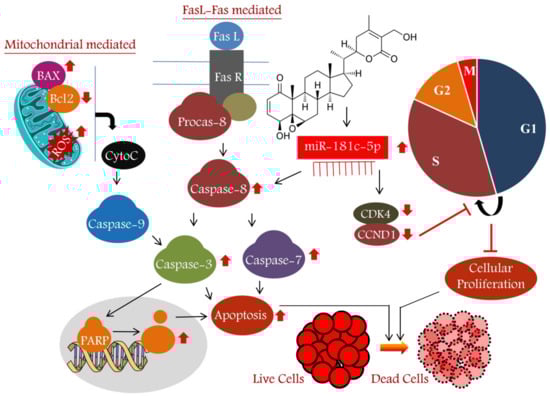 Figure 8. The microRNA-mediated anticancer mode of action of Withaferin A in triple-negative breast cancer cells. Withaferin A treatment increased miR-181c-5p expression, which reduces cellular proliferation and induces apoptosis in MDA-MB-231 cells. CytoC—Cytochrome C; Fas—Fas ligand; Fas R—Fas receptor; Procas—Procaspase; ROS—Reactive oxygen species; G2—G2 phase; M—M phase; G1—G1 phase; S—S phase.