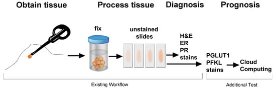 Workflow from patient to cloud computing. Tissue sections are stained with H&E and in some cases for estrogen and progesterone receptors. Implementation of this test only requires two additional stains to assess glycolytic enzyme patterns followed by cloud computation of the patient’s outcome.