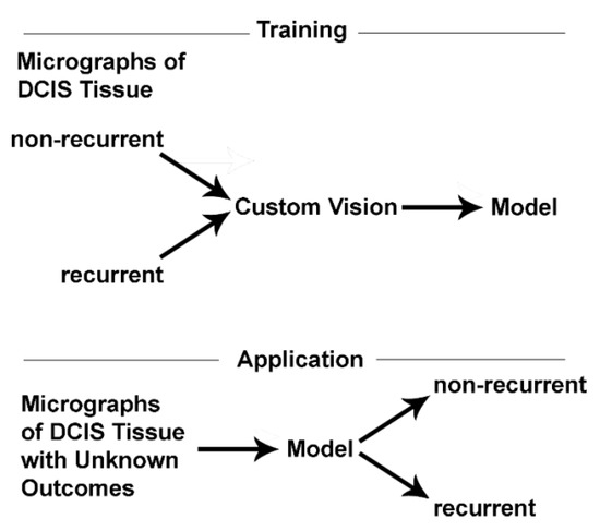 A broad illustration of the steps involved in the training and application phases of machine learning are shown. These studies constitute a binary classifier wherein training is performed using images of known non-recurrent and recurrent samples. The models developed during the training phase are tested in the application phase using holdout data that were not used in the creation of the models.