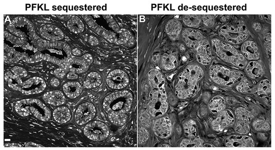 PFKL labeling of tissue sections from patients who would later be determined to be a non-recurrent (A) or a recurrent (B) patient. Note that PFKL is sequestered in (A) and de-sequestered in (B). Accumulation at the periphery of cells after de-sequestration in (B) suggests that PFKL can participate in metabolon formation with glycolytic elements at the plasma membrane (Bar = 25 μm, lower right).