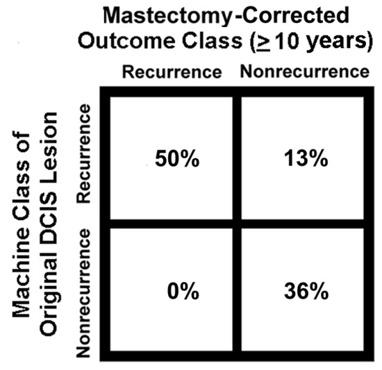 Phospho-Ser226-GLUT1 and PFKL labeling patterns (Figure 3A,B and Figure 4) of holdout samples were evaluated with computer models (Figure 2) to predict patient outcomes. These outcomes were summed then plotted in the confusion matrix of Figure 5. The confusion matrix used all holdout studies (N = 175) and the same computational models for phospho-Ser226-GLUT1 and PFKL-based outcome predictions; thus, this figure is a recalculation of patient outcomes, not a compilation of patient outcomes reported in separate papers. This includes patient holdout experiments wherein these patients’ micrographs were not used in computer training and micrograph holdout experiments in which specific micrographs used in the holdout experiments were not used for training. As indicated in Figure 5, the results were corrected for mastectomies. This is necessary because many mastectomies are successful, and the patients will therefore appear as computationally recurrent patients who are clinically non-recurrent. The adjustment was determined by subtracting the percentage of DCIS patients who recur after partial mastectomies (10%) [17] from the percentage of patients who recur after treatment with biopsy alone (i.e., without mastectomies) (≅50%) [18,19,20,21]. When this 2 × 2 contingency table was analyzed by Fisher’s exact test, p < 0.0001 was obtained. The absence of false negatives indicates that no ill women go undetected. Along this same line of reasoning, it should be noted that all the computed non-recurrent samples were in the clinical non-recurrent group of patients. This group of patients will not have a cancer recurrence, and therefore are overdiagnosed and require no intervention.