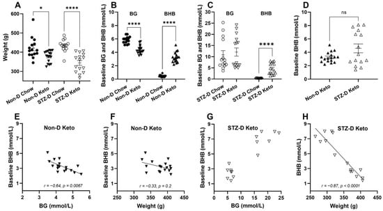 The effects of three weeks of nutritional ketosis of bodyweight, blood glucose (BG) and β-hydroxybutyrate (BHB) of non-diabetic and STZ-diabetic rats. Diabetes was induced with a single i.p. injection of 60 mg/kg STZ (citrate buffer was used in non-diabetic controls), followed by 3 weeks of dietary intervention. (A) Significantly lower bodyweight in ketogenic diet-fed non-diabetic (Non-D Keto) and diabetic (STZ-D Keto) rats compared to respective chow-fed controls; (B) Non-D Keto rats had lower BG and higher BHB concentrations than chow fed controls; (C) Keto diet did not affect BG in STZ-diabetic rats, but significantly elevated BHB; (D) No differences in baseline BHB of Non-D Keto and STZ-D Keto rats were observed; (E) Baseline BHB inversely correlated with BG in Non-D Keto rats; (F) BHB did not significantly correlate with weight in Non-D Keto rats; (G) Highest BHB concentrations in STZ-D Keto rats corresponded to the highest BG; (H) A strong inverse correlation between bodyweight and BHB was detected in STZ-D Keto rats. Data were analysed by Mann–Whitney tests (A–C), Welch’s t-test (D), Spearman’s correlation (E,F). Data shown as mean ± SEM, * p < 0.05, **** p < 0.0001.