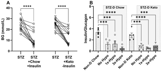 The following supporting information can be downloaded at: https://www.mdpi.com/article/10.3390/metabo13010042/s1, Figure S1: Insulin supplementation in STZ-D Keto-fed rats induced profound hypoglycemia; Figure S2: Differential changes in circulating insulin and glucagon in non-diabetic and diabetic rats; Figure S3: C-peptide concentration inversely related to BG and BHB; Table S1: Blood glucose (BG) and β-hydroxybutyrate (BHB) before (0 min) and after (120 min) insulin (or vehicle) injection.