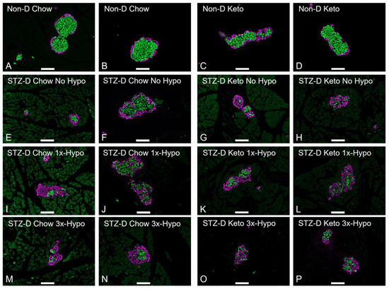 Changes in pancreatic islet morphology in STZ-injected rats. 5-µm sections of the pancreas were stained for insulin (green) and glucagon (purple); representative images are shown (scale bar 100 µm). (A,B) Non-diabetic chow-fed control; (C,D) Non-diabetic keto-fed control; (E,F) STZ-treated Chow No Hypo control; (G,H) STZ-treated Keto No Hypo Control; (I,J) STZ-treated Chow single hypoglycemia; (K,L) STZ-treated Keto single hypoglycemia; (M,N) STZ-diabetic Chow recurrent hypoglycemia; (O,P) STZ-diabetic Keto recurrent hypoglycemia.